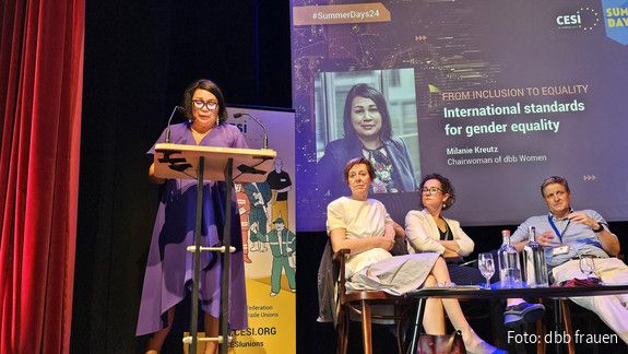 „Wir müssen ein Umfeld schaffen, in dem sich Frauen bestärkt fühlen, zu führen und Neues zu wagen und damit historische Schranken einzureißen“, machte Milanie Kreutz, Vorsitzende der dbb bundesfrauenvertretung, in ihrem Vortrag auf den CESI Summer Days am 27. Juni 2024 in Brüssel deutlich. Dazu gehören kulturelle und gesellschaftliche Normen, Zugang zu Bildungs- und Aufstiegsmöglichkeiten, Repräsentation, Sichtbarkeit und politische Unterstützung. Kreutz weiter: „Als Gewerkschaften ist es unsere Pflicht, sicherzustellen, dass Regierungen und Arbeitgeber den Gender Digital Divide schließen, die Diskriminierungsfreiheit von KI-Algorithmen und Datenschutz gewährlisten und bei allen Prozessen transparent bleiben. Verantwortlichkeit muss klar benannt sein, um Nutzerinnen und Nutzer zu schützen und Vertrauen in digitale Systeme aufzubauen.“ Um dies zu erreichen, brauche es einen konzertierten Einsatz, um Cybermobbing, Hassrede und andere Formen der Gewalt im Cyberspace einzuschränken. „Wir müssen robuste Maßnahmen und Systeme entwickeln, um Opfer zu schützen und Täter zur Rechenschaft zu ziehen“, erklärte Kreutz. Der öffentliche Dienst – von der Gesetzgebung über soziale Dienste, Gesundheitsversorgung und Sicherheit – sei essentiell, um diese Systeme bereitzustellen.