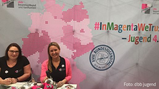 Sabrina Dahmen (links) und Jenny Ferdinand von der Kreisjugendgruppe Düsseldorf (dbbj nrw) unterstützen die dbb jugend (Bund) an dem Stand auf dem DJHT.