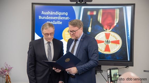 Staatssekretär Torsten Lang überreichte dem Vorsitzenden der dbb bundessenioren die Auszeichnung für sein jahrzehntelanges ehrenamtliches Engagement.
