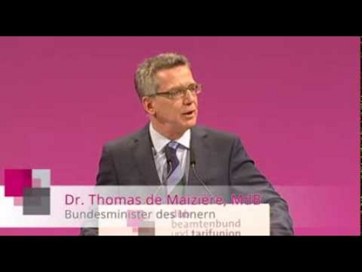 In seiner Rede bilanzierte Bundesinnenminister de Maizière, dass es Deutsch-land gut gehe, auch dank der funktionierenden Strukturen im öffentlichen Dienst und seiner fähigen und loyalen Beschäftigten: „Der öffentliche Dienst ist ein wichtiger Standortfaktor für die Unternehmer und ein Stück Lebensqualität für jeden Bürger.“ Die Beschäftigten im öffentlichen Dienst seien tatsächlich für den Bürger „stets zu Diensten“, was keineswegs eine altmodische, sondern eine noble Aufgabe sei. Hinter das Tagungsmotto gehöre daher ein Ausrufe- und kein Fragezeichen.