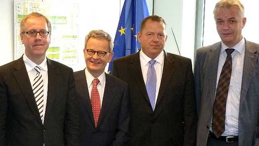 V.l.n.r.: Eigenthaler, EU Generaldirektor Walter Deffaa, DSTG Bundesgeschäftsführer Rafael Zender und Head of Unit Manfred Bergmann (KOM)