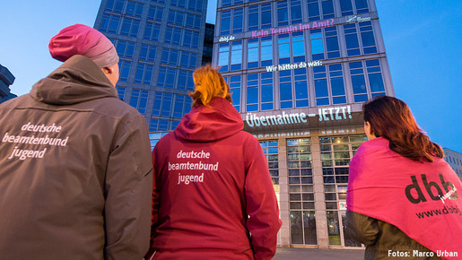 In den frühen Morgenstunden wurden so viele Passanten auf ihrem Weg zur Arbeit auf die Forderung der dbb jugend aufmerksam. Mit dem Slogan „Kein Termin im Amt? – Wir hätten da was: Übernahme - JETZT!“ präsentierte die Jugend ihre Lösung für einen personell gut aufgestellten öffentlichen Dienst. „Angesichts der Tatsache, dass dem öffentlichen Dienst 200.000 Stellen fehlen ist es traurig, dass wir Herrn Dr. Böhle unsere Forderungen schon an die Fassade schreiben müssen, damit er diese endlich versteht. Die Übernahme der Auszubildenden sollte selbstverständlich sein“, unterstrich die Vorsitzende der dbb jugend, Karoline Hermann.