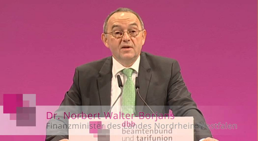 Als "schmerzhaften Schritt" hat Norbert Walter-Borjans, Finanzminister des Landes Nordrhein-Westfalen, die äußerst eingeschränkte Anpassung der Beamtenbesoldung in NRW bezeichnet. Zugleich räumte er ein, die rechtliche Überprüfung dieser Entscheidung der Landesregierung sei das gute Recht der Gewerkschaften. Auf der 55. Jahrestagung des dbb sagte der Finanzminister am 6. Januar 2014 in Köln, man habe sich bewusst dafür entschieden, das Tarifergebnis für die unteren Einkommensgruppen zu übertragen, die oberen Besoldungsgruppen aber nicht analog zu berücksichtigen. Der dbb Bundesvorsitzende Klaus Dauderstädt stellte im Anschluss klar, die gerichtliche Überprüfung sei "nur die Notlösung", gefordert sei "eigentlich eine politische Entscheidung".