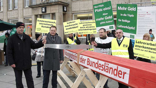 Mit einer Aufsehen erregenden Aktion haben Lehrerinnen und Lehrer aller Schularten am 26. Januar 2011 in Dresden auf ihre berechtigten Forderungen in der diesjährigen Einkommensrunde für die Landesbeschäftigten hingewiesen. Symbolisch zersägten sie einen sieben Meter langen Rotstift und wiesen auf die andauernde Sparpolitik im Bildungsbereich hin. Unter dem Motto „Wir machen das. Wer sonst?“ berichteten sie von immer weiter steigender Arbeitsbelastung und nicht angemessener Bezahlung. „Trotzdem können sich Schüler und Eltern auf uns verlassen. Wir wollen, dass unsere Kinder die bestmögliche Bildung bekommen“, betonten die Vertreter der dbb Lehrergewerkschaften auf dem Platz vor der Altmarkt-Galerie.