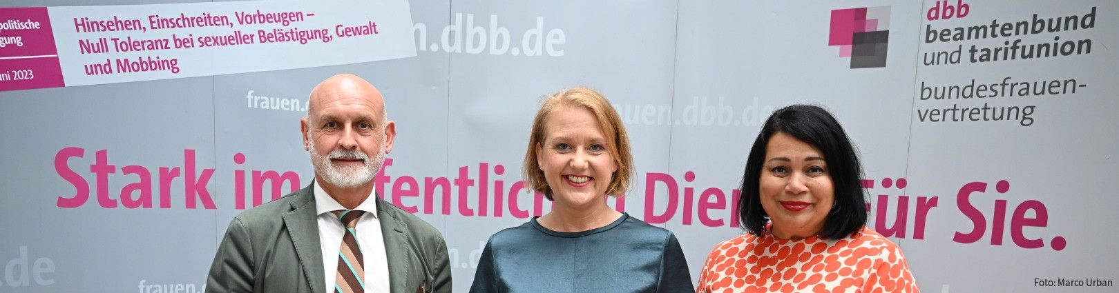 Unter dem Motto „Hinsehen, Einschreiten, Vorbeugen - Null Toleranz bei sexueller Belästigung, Gewalt und Mobbing“ beschäftigten sich die dbb frauen auf der 17. Frauenpolitischen Fachtagung am 14. Juni 2023 mit den Formen von Übergriffen und Lösungsansätzen. Gemeinsam mit Expertinnen und Experten, Meinungsführenden sowie Entscheidungsträgerinnen und Entscheidungsträgern aus Politik, Verwaltung und den dbb Gewerkschaften gingen sie den Fragen nach, wie man Übergriffe erkennt, wie man einschreiten soll und wie man sie verhindern kann. Die Veranstaltung fand im dbb Forum in Berlin statt.