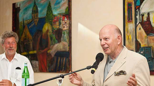 dbb Chef Peter Heesen sprach von Weimar als „Stadt, die symbolhaft für die deutsche Kultur steht“ und nannte Moegelins Bilder „beeindruckende Impressionen dieses wunderbaren Ortes“. Prof. Christoph Stölzl, der nach seinen Tätigkeiten in Berlin – hier war er von 1987 bis 1999 Generaldirektor des Deutschen Historischen Museums, später Feuilletonchef der „Welt“ und schließlich Kultursenator - nun Präsident der renommierten Weimarer Musikhochschule „Franz Liszt“ ist, unterhielt die Zuhörer mit einem anekdotenreichen Ausflug in die Kultur- und Kunstgeschichte der Stadt und empfahl: „Wer noch nicht dort war, muss unbedingt hin. Nach Weimar will man immer wieder zurück.“ Der Kunstexperte lobte Moegelins „wilden Zugriff“ auf die Realität: „Seine Bilder sind sehr heftig, sie haben Kraft. Moegelin erinnert sich an die Errungenschaften des Expressionismus und wendet sie an. Seine Arbeiten zeigen, dass Gestus, Pathos und entfesselte Farbigkeit unvergänglich sind.“ Bilder, so Stölzl, „sollen nicht beim Künstler bleiben, sondern müssen hinaus in die Welt“. Das ließen sich manche Besucher nicht zwei Mal sagen: Einige der im dbb club gezeigten Arbeiten bekamen umgehend einen „Verkauft“-Vermerk.