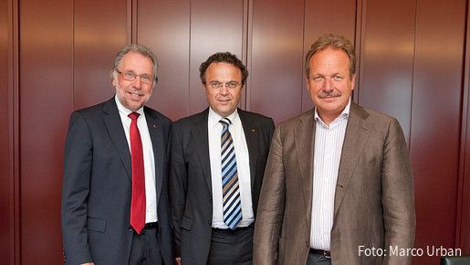 Die Verhandlungsführer: Frank Stöhr, 1. Vorsitzender der dbb tarifunion, Bundesinnenminister Dr. Hans-Peter Friedrich, Frank Bsirske, ver.di Vorsitzender. Nicht im Bild: VKA-Verhandlungsführer Dr. Thomas Böhle